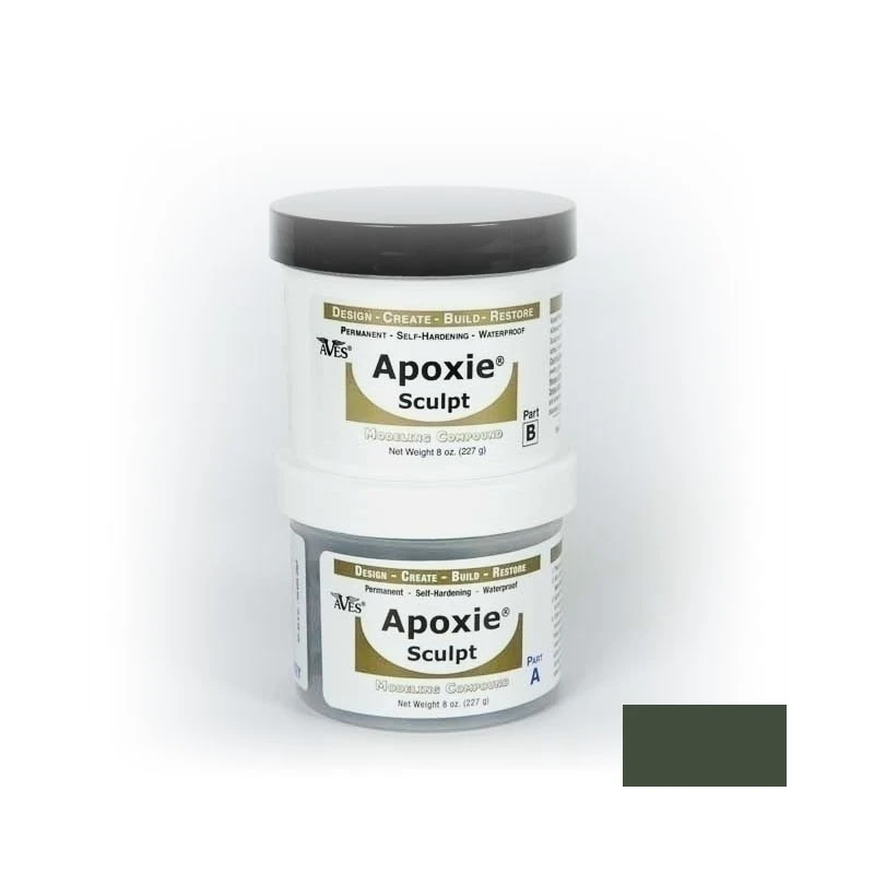 L’apoxie sculpt est une résine bicomposante de couleur qui sèche à l’air. Facile à prendre en main, elle se comporte comme du mastic. Une fois les deux parties mélangées, le temps de travail et de 2 à 3h. Le durcissement total est atteint au bout de 24h. Peut etre lissé au doigt ou avec un outil avant durcissement. Peut être poncé, percé, scié une fois durcis. Adhère à quasiment tout type de surface.