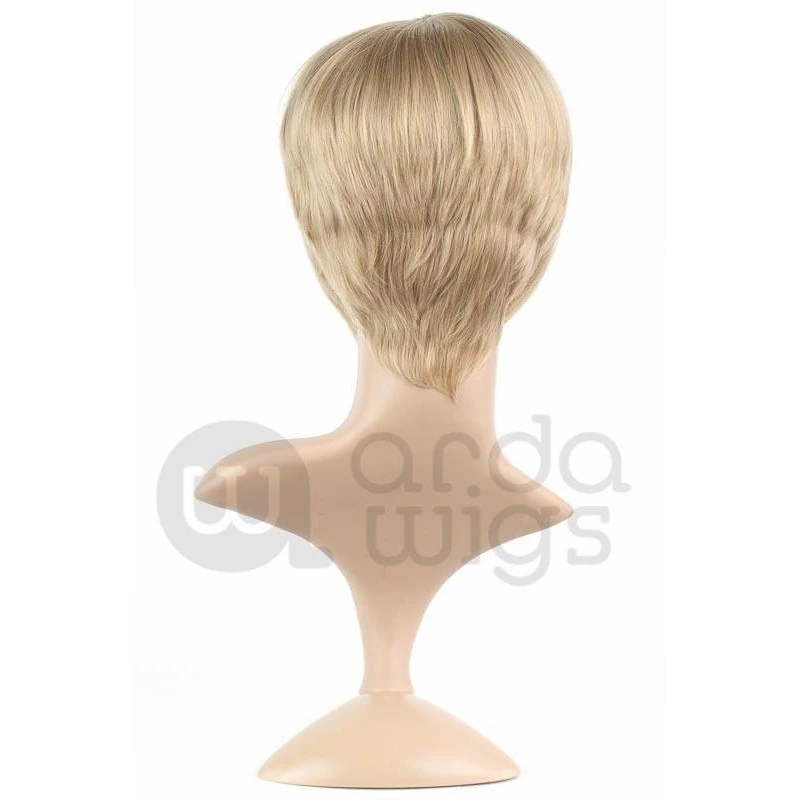 This wig is extra short in the back and has 12″ (30.5 cm) long bangs in the front. Instead of a side part in this wig, there is a small 1.5″ (2 cm) radial skin top at the crown of the head, making the long bangs easy to part on whatever side the character design calls for.