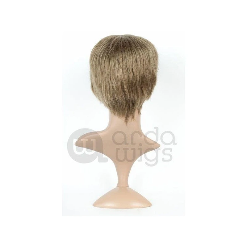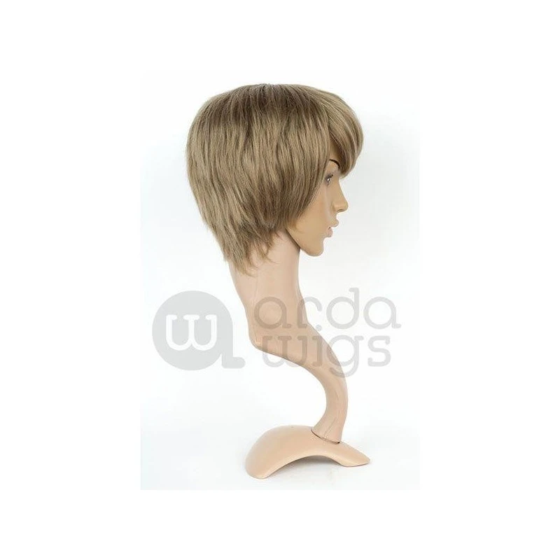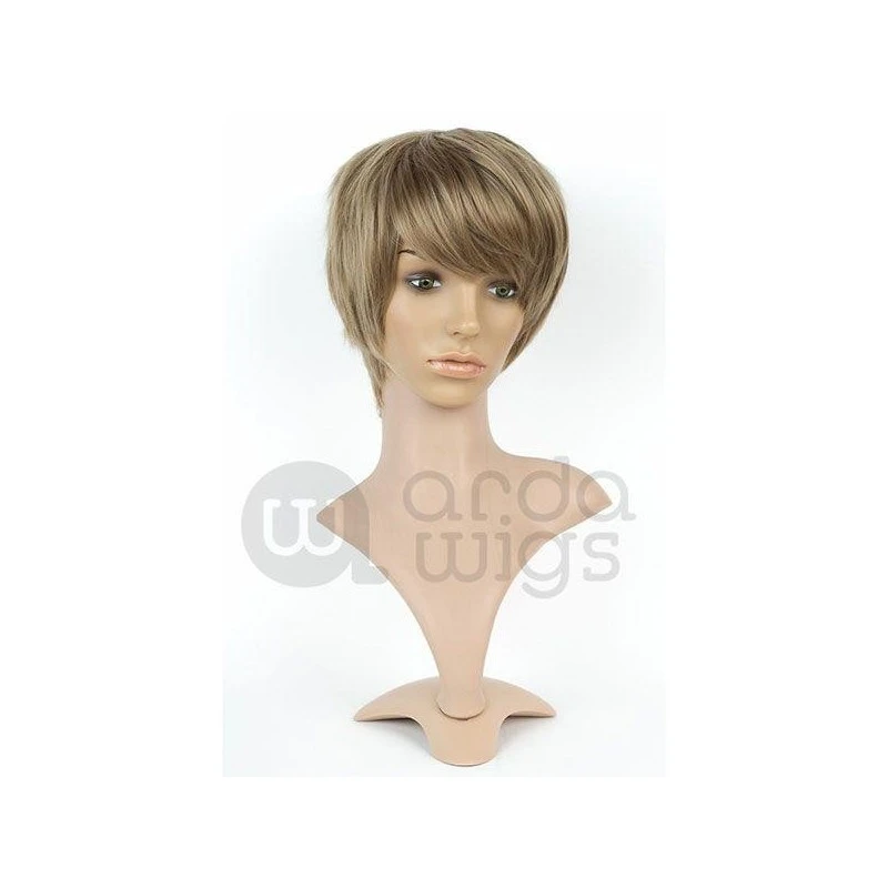 A short, scruffy wig with a small 1″ (2.5 cm) skin top at the crown. The fibers are straight and do not flip out like a Hansel, but they are of a similar length. Shorter in the back, with long bangs that hit the bridge of the nose on a person’s head.